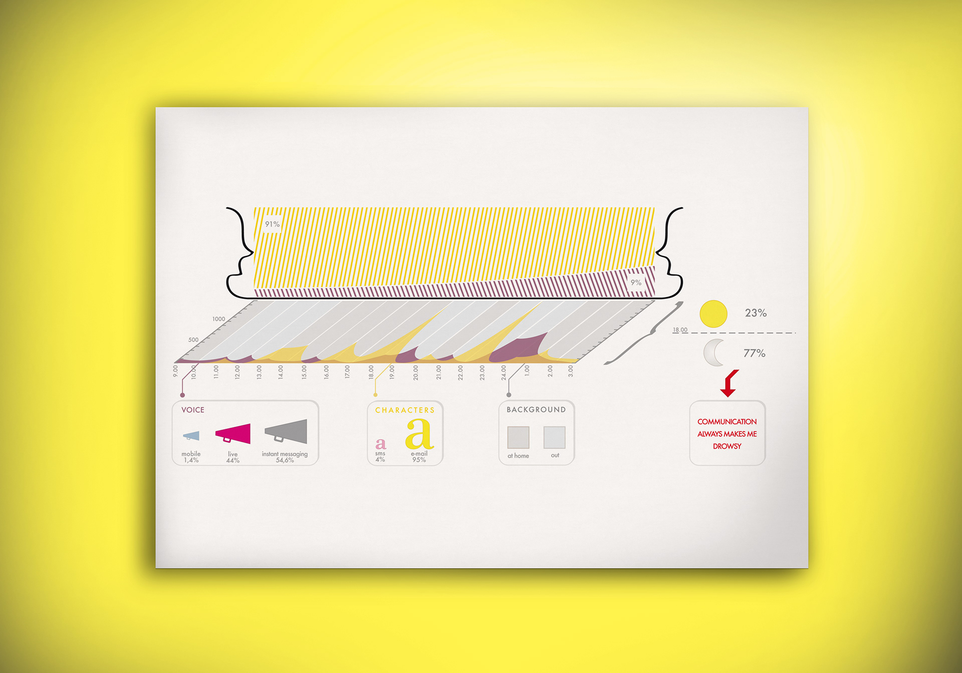 An infographic journey into my communications. The infographic visualise my communications with people, considering both text messages and talking. It is evident how at night I should sleep more and text less!